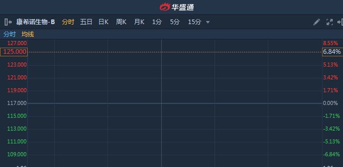 智通财经APP获悉,康希诺生物-B(06185)市前现一宗大手成交,每股作价118.877元,涉及28.8万股,涉资3423.66万元。截至9时20分,涨6.84%,报价125港元,成交额5303万。