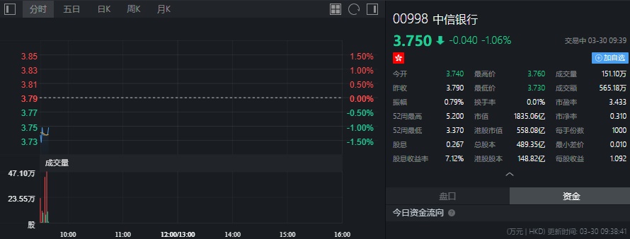 截至发稿,中信银行跌1.06%,报3.75港元。