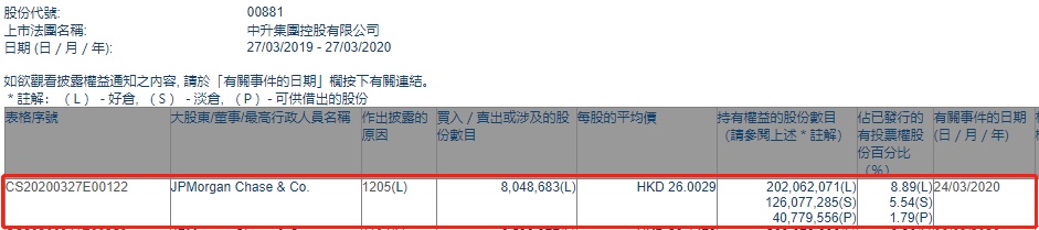 智通财经APP获悉,联交所最新资料显示,3月24日,摩根大通减持中升控股(00881)804.8683万股,每股作价26.0029港元,总金额约为2.09亿港元。减持后最新持股数目约为2.02亿股,最新持股比例为8.89%。