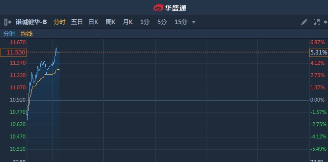 智通财经APP获悉,次新股诺诚健华-B(09969)早盘急升逾5%,高见11.6港元破顶。截至10时07分,涨5.31%,报价11.5港元,成交额7371万。