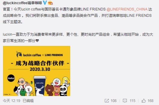 据了解,瑞幸咖啡与LINE FRIENDS合作商品将会在近期上市,联名线下主题店也将在下半年与消费者见面。