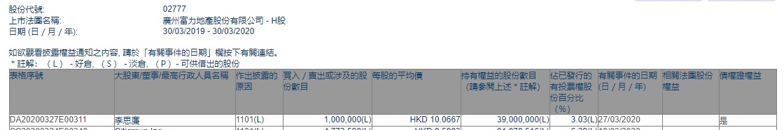 3月30日,港交所披露的信息显示,3月27日,富力地产(02777)联席董事长兼执行董事李思廉增持100万股,每股作价10.0667港元,总金额约为1006万港元,最新持股比例为3.03%。