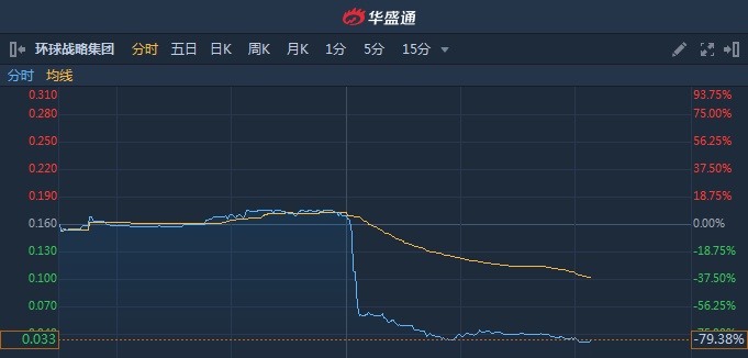智通财经APP获悉,细价股环球战略集团(08007)午后现“断崖式”暴跌,盘中低见0.031港元,创逾十年新低,截至15时07分,跌79.38%,报价0.033港元,成交额7717万。