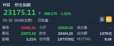 智通财经APP获悉,恒指早盘低开463.43点或1.97%,报23020.85点。截至收盘,恒生指数跌309.17点或1.32%,报23175.11点,全日成交额达1079.49亿。国企指数跌1.08%,报9402.18点,红筹指数跌1.4%,报3485.15点。