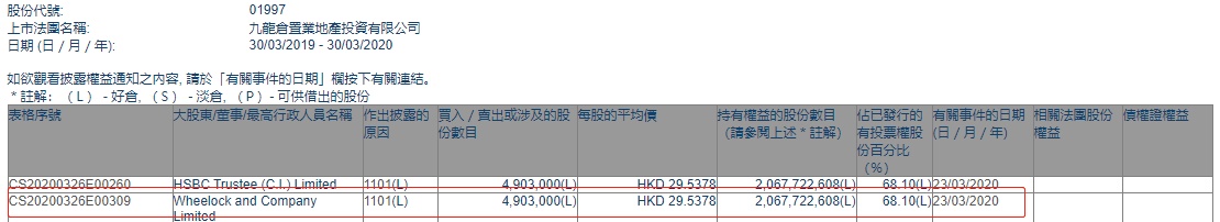 智通财经APP获悉,联交所最新资料显示,3月23日,会德丰增持九龙仓置业(01997)约490万股,每股作价29.5378港元,总金额约为1.4亿港元。增持后最新持股数目约为20.68亿股,最新持股比例为68.10%。
