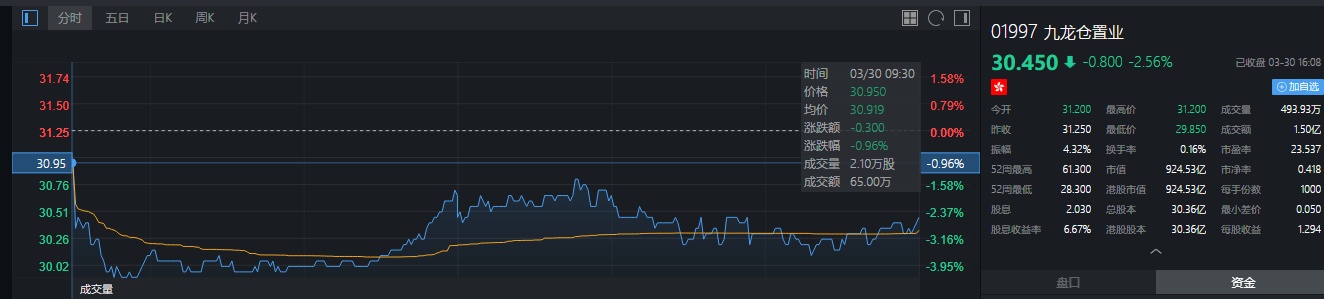 截止至3月30日收盘,九龙仓置业跌2.56%,报价30.45港元。