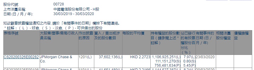 智通财经APP获悉,联交所最新资料显示,3月23日,摩根大通减持中国电信(00728)3760.21万股,每股作价2.27港元,总金额约为8535.67万港元。减持后最新持股数目约为11.06亿股,最新持股比例为7.97%。