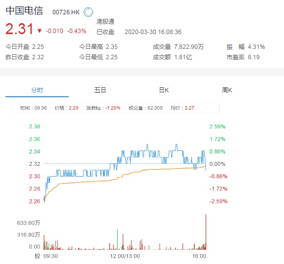 截至今日收盘,中国电信跌0.43%,报2.31港元。