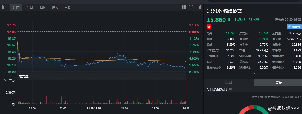 截至今日收盘,福耀玻璃(03606)跌7.03%,报15.86港元。