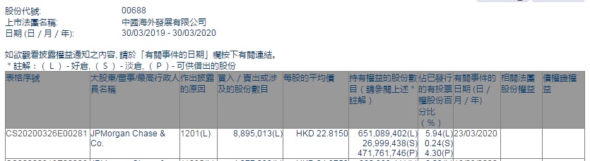 智通财经APP获悉,联交所最新资料显示,3月23日,摩根大通减持中国海外发展(00688)889.5万股,每股作价22.81港元,总金额约为2.02亿港元。减持后最新持股数目约为6.51亿股,最新持股比例为5.94%。