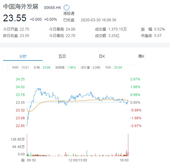 截至今日收盘,中国海外发展无涨跌幅,报23.55港元。