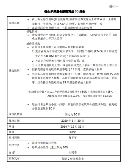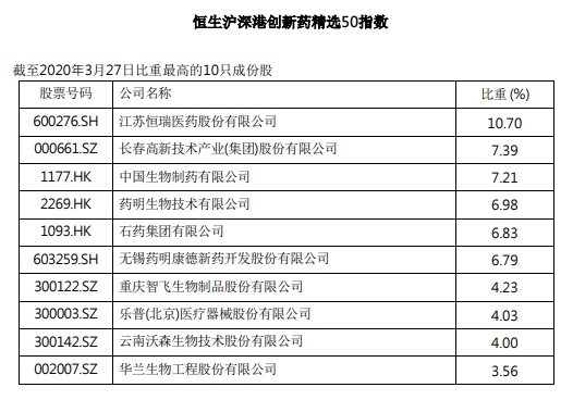 截至2020年3月27日,入选恒生沪深港创新药精选 50 指数中比重最高的10只成份股的港股有:中国生物制药(01177),占比7.21%;药明生物(02269),占比6.98%以及石药集团(01093),占比6.83%。