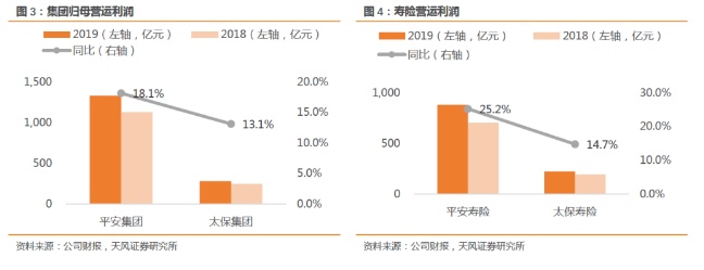 平安和太保均披露了营运利润,剔除短期投资波动、评估假设变动影响、一次性重大项目调整,更能反映保险公司长期、稳定的盈利能力。平安、太保2019年集团归母营运利润分别同比+18.1%、+13.1%,其中下半年同比+11.8%、+11.6%;寿险业务营运利润分别同比增长25.2%、14.7%,下半年同比+13.6%、+10.8%。