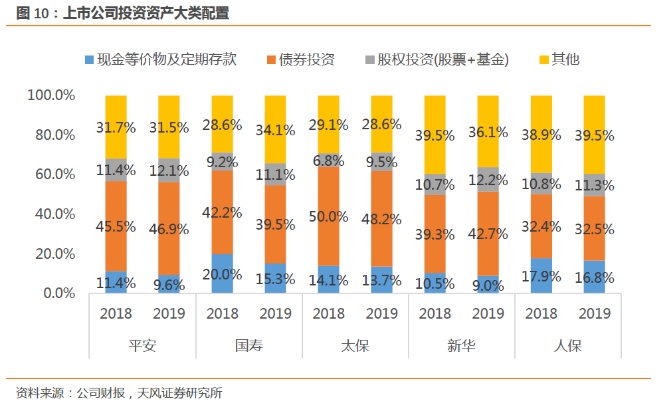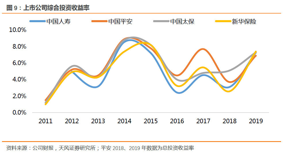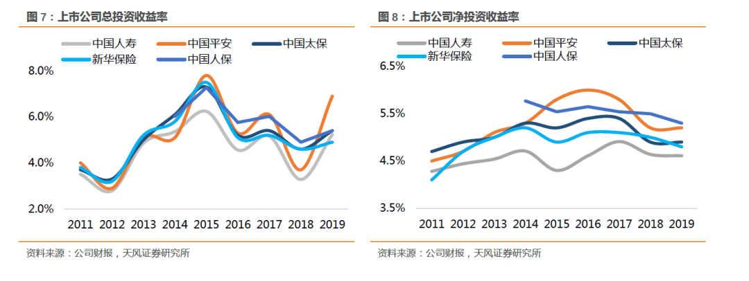 2019年股市表现较好(2019年沪深300指数上涨36.1%,而2018年下跌25.3%),因此保险公司的总投资收益率和综合投资收益率同比大幅提升。2019年中国平安,中国人寿,中国太保,新华保险,中国人保的总投资收益率分别为6.9%、5.2%、5.4%、4.9%、5.4%,分别同比+3.2pct、+2.0pct、+0.8pct、+0.3pct、+0.5pct。在I39准则下,考虑可供出售金融资产的浮盈,国寿、太保、新华、人保的综合投资收益率分别为7.3%、7.3%、7.4%和7.6%,分别同比+4.2pct、+2.2pct、+4.8pct、+3.1pct。