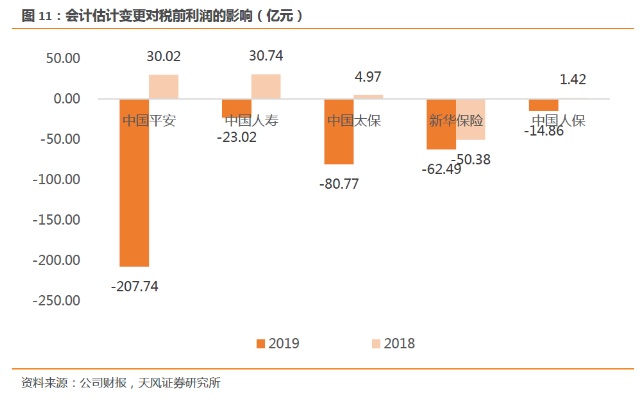 2019年中国平安、中国人寿、中国太保、新华保险、中国人保会计估计变更对税前利润的影响分别为-208亿元、-23亿元、-81亿元、-62亿元、-15亿元,而2018年分别为+30亿元、+31亿元、+5亿元、-50亿元、+1亿元。准备金增提有助于减轻2020年净利润增长的压力。
