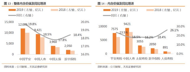 2019年中国平安、中国太保的集团内含价值分别为12005亿元、3960亿元,分别较年初+19.8%、17.8%;平安寿险、中国人寿、太保寿险、新华保险、人保寿险的内含价值分别为7575亿元、9421亿元、3055亿元、2050亿元、891亿元,分别较年初+23.5%、18.5%、18.2%、18.4%、26.1%。