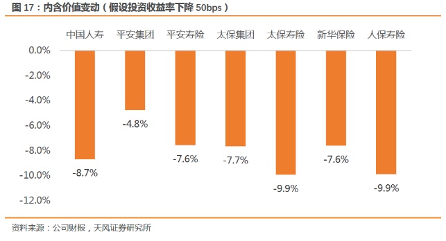 我们可以通过内含价值报告中的敏感性分析来判断保险公司内含价值的稳定性。以“投资回报率假设下降50个bp”对内含价值的影响进行对比,平安集团的内含价值稳定性最高,内含价值仅折价-4.8%;在寿险公司中,平安寿险、新华保险的变动比例为-7.6%,其次为国寿,变动比例为-8.7%;太保寿险和人保寿险变动比例为-9.9%。