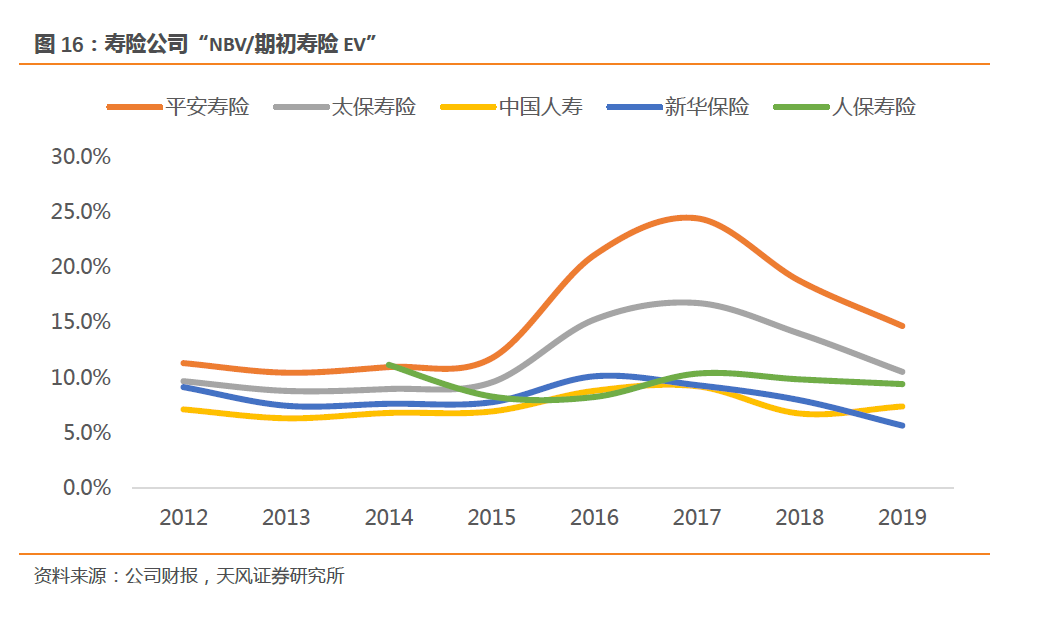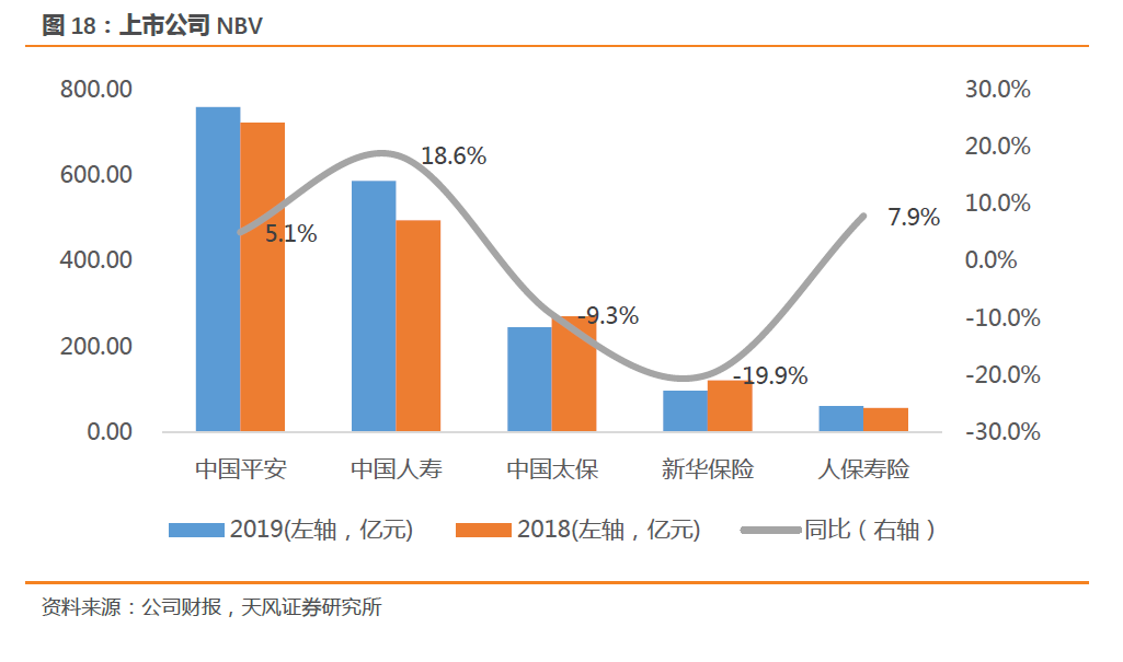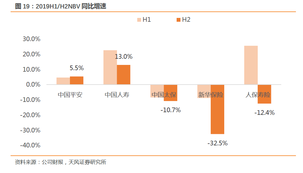 2019年中国平安、中国人寿、中国太保、新华保险、人保寿险的NBV分别同比+5.1%、+18.6%、-9.3%、-19.9%、+7.9%,下半年NBV分别同比+5.5%、+13.0%、-10.7%、-32.5%、-12.4%。