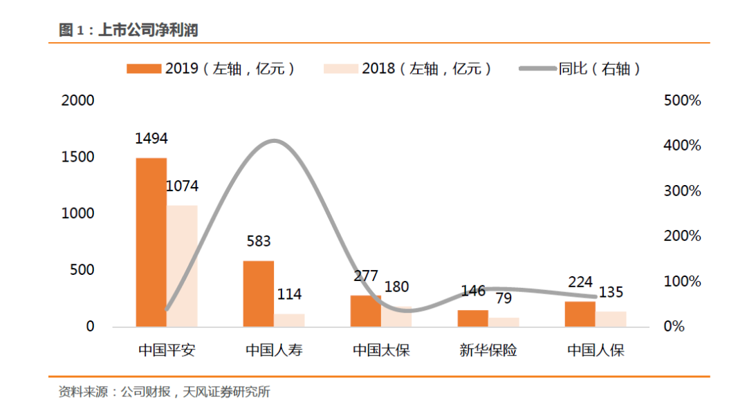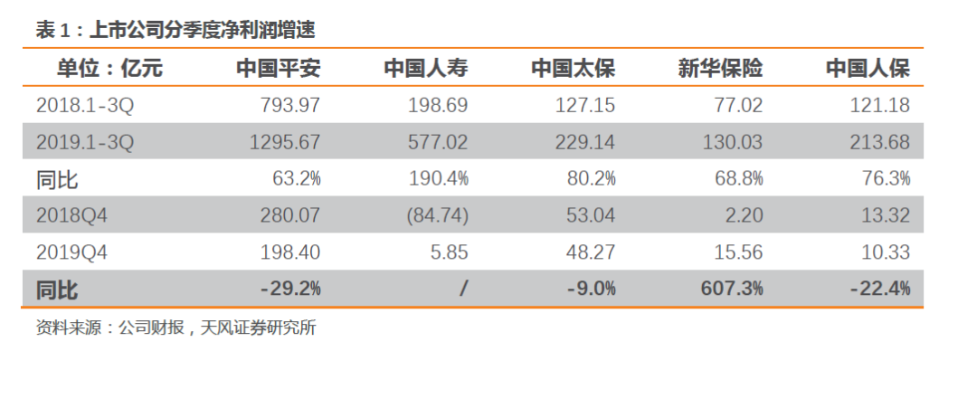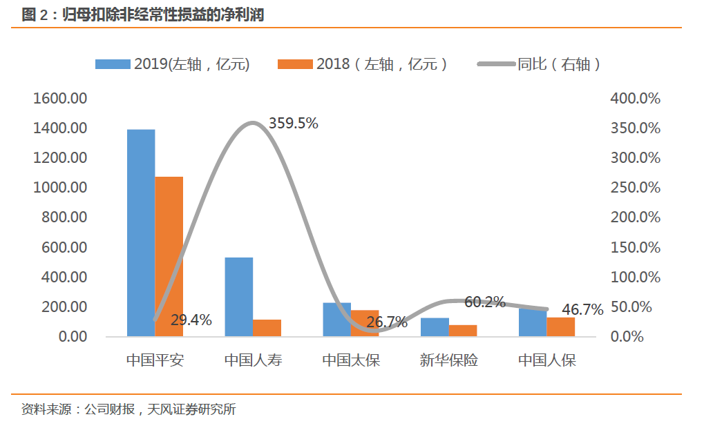 2019年中国平安、中国人寿、中国太保、新华保险、中国人保分别实现归母净利润1494亿元、583亿元、277亿元、146亿元和224亿元,分别同比+39.1%、+411.5%、+54.0%、+83.8%、+66.6%;其中4季度单季,平安、太保、新华、人保净利润分别同比-29.2%,-9.0%,+607.3%,-22.4%,国寿扭亏为盈。税收新政利好是利润高增长的重要原因,扣除2018年汇算清缴返回的所得税(扣除“非经常性损益”项目)后,平安、国寿、太保、新华、人保的净利润分别同比+29.4%、+359.5%、+26.7%、+60.2%、+46.7%。