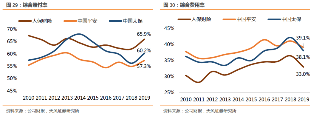 2019年人保财险、平安产险、太保产险综合成本率分别为98.9%、96.4%、98.3%,分别同比+0.4pct、+0.4pct、-0.1pct。各公司费用率均大幅下降,主要由手续费率下降带来;赔付率均有所提升,主要受暴雨等重大自然灾害及非洲猪瘟等公共卫生事件,及分母(已赚保费)下降的影响,人保和平安的保证保险的赔付率也在上升。