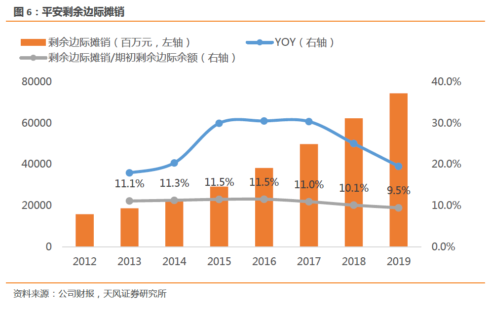 剩余边际摊销是当年利润的核心来源,2019年平安寿险剩余边际摊销(745亿)占税前营运利润比例为74%。受新单保费,尤其是长期保障型产品保费增速放缓的影响,平安寿险剩余边际摊销规模/年初剩余边际余额的比例在缓慢下降,从而影响营运利润增长。