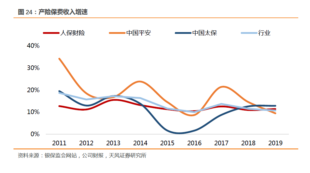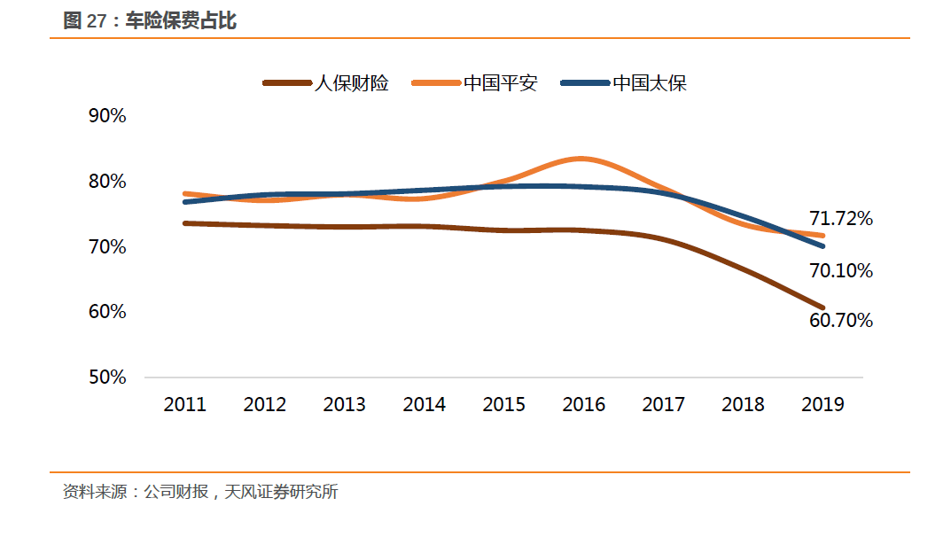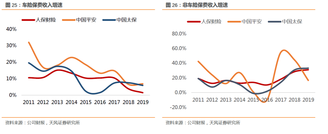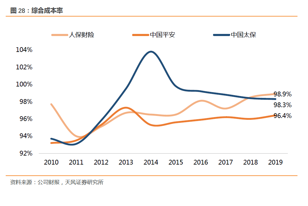 太保的财险保费的增速及综合成本率的变动趋势好于其他两家公司。2019年财产险保费增速保持平稳,全行业保费收入同比+10.7%。人保财险、平安产险、太保产险保费收入分别同比+11.4%、+9.5%和+12.9%。非车险业务增速均高于车险业务,非车险占比提升。人保财险、平安产险、太保产险非车险保费占比分别同比+5.9pct、+1.7pct、4.6pct。