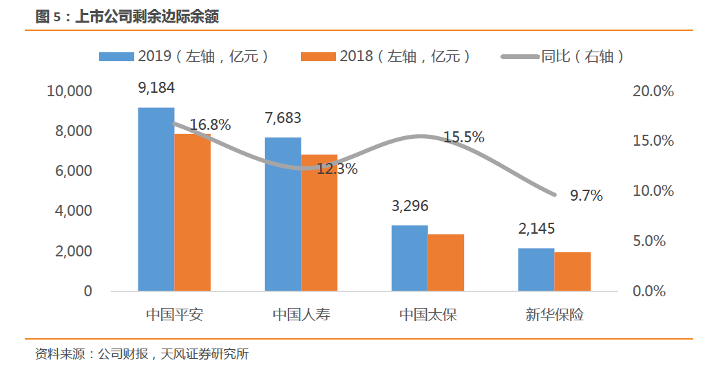 2019年末中国平安、中国人寿、中国太保、新华保险的剩余边际余额分别为9184、7683、3296、2145亿元,分别较年初+16.8%、+12.3%、+15.5%、+9.7%,增长均较2018年放缓,分别放缓10.9pct、0.2pct、9.5pct、5.1pct。期末剩余边际= 期初剩余边际+ 新业务贡献+ 预期利息增长+ 营运偏差-剩余边际摊销,其中“新业务贡献”是影响剩余边际余额增长的重要因素,由于平安、太保、新华的新单保费均为负增长,导致剩余边际余额的同比增速大幅放缓。