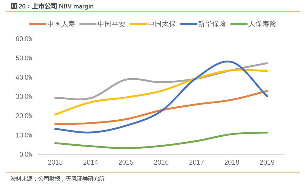 平安NBV同比增长由价值率提升带来,而新单保费同比-3.0%;国寿、人保寿险NBV同比增长由价值率提升及新单保费增长双轮驱动带来;新华、太保margin有所下降,新单保费亦同比负增。2019年中国平安、中国人寿、中国太保、新华保险、人保寿险的NBV Margin分别为47.3%、32.9%、43.3%、30.3%、11.4%,同比+3.6pct、+4.6pct、-0.4pct、-17.6pct、+0.8pct。