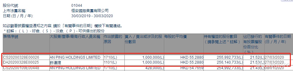 智通财经APP获悉,联交所最新资料显示,3月27日,副主席兼行政总裁许连捷增持恒安国际(01044)100万股,每股作价55.288港元,总金额为5528.8万港元。增持后最新持股数目约为2.56亿股,最新持股比例为21.53%。