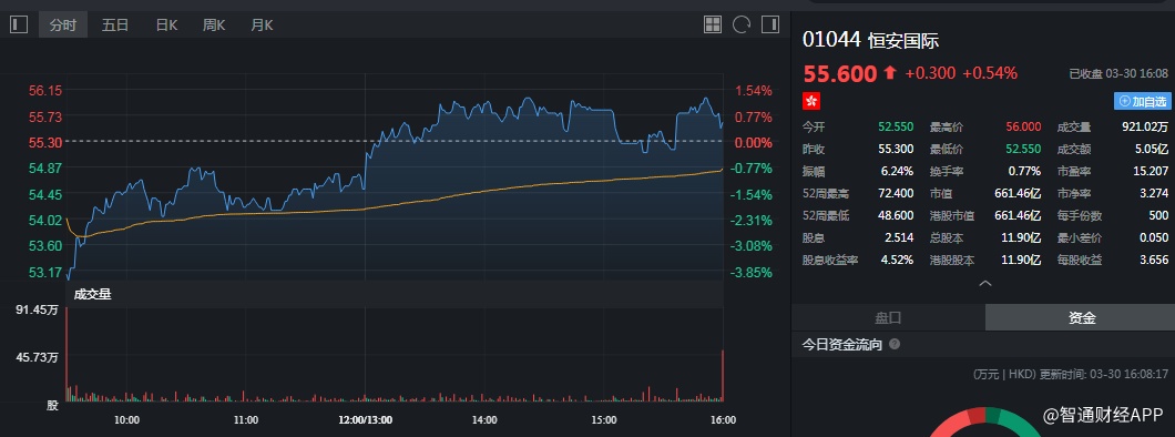 截至今日收盘,恒安国际涨0.54%,报55.60港元。
