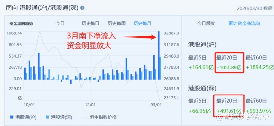 图:3月份南下净流入的资金明显放大,最近20日净流入超1500亿 来源:富途