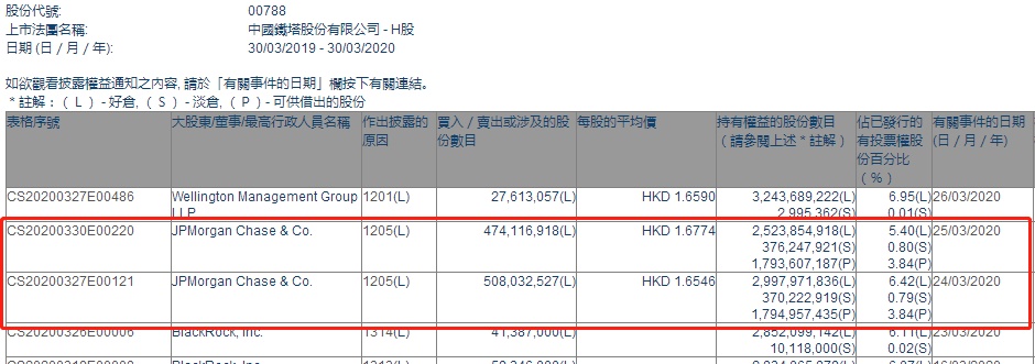智通财经APP获悉,联交所最新资料显示,3月24日至25日,摩根大通分别减持中国铁塔(00788)5.08亿、4.74亿股,每股作价分别为1.6546港元和1.6774港元,总金额约为16.36亿港元。减持后最新持股数目为25.24亿股,最新持股比例为5.40%。