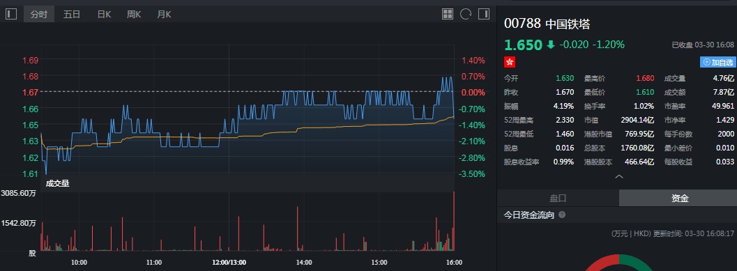 截至今日收盘,中国铁塔跌1.20%,报1.65港元。