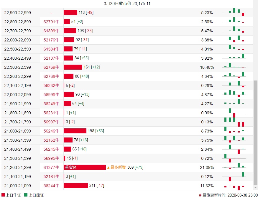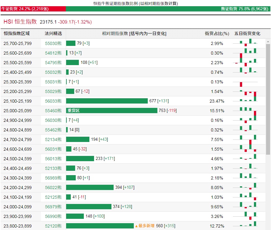 智通财经APP获悉,截至3月30日,恒指最新的牛熊街货比例24:76。法兴恒指牛熊证街货分布图中的数据显示,熊证街货重货区在25000-25099区间,该区间最新熊证数量为753张,较上一交易日减少119张,最多新增在23800-23899区间,该区间最新熊证数量为560张,较上一交易日增加315张。牛证街货重货区在21200-21299区间,该区间最新牛证数量为369张,较上一交易日增加79张,最多新增也在此区间。
