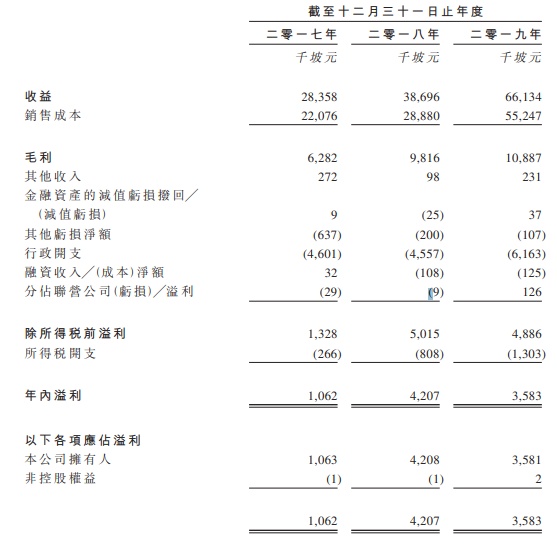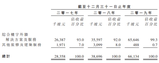 于往绩期间,该企业绝大部分收益来自综合楼宇外墙解决方案及服务,余下收益则来自其他装修及建筑服务。于2017财政年度、2018财政年度及2019财政年度,该企业产生收益分别约2836万坡元、3870万坡元及6613万坡元,同比增长约36.5%及70.9%,乃主要由于楼宇外墙项目所得收益增长。