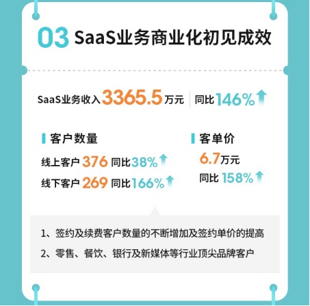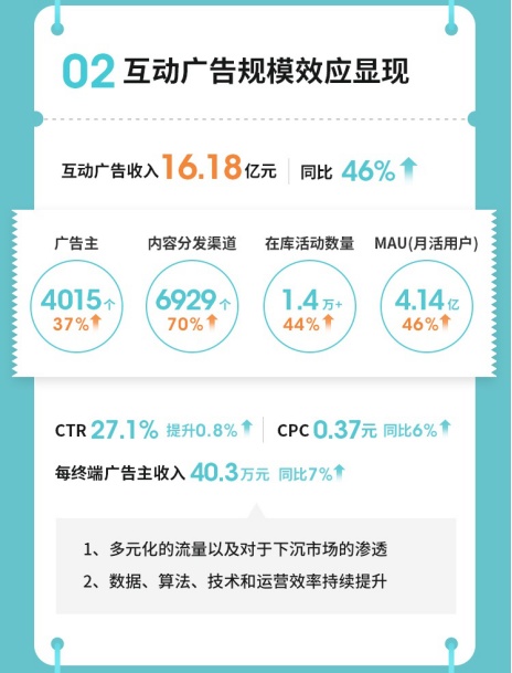 其中,互动广告业务受益规模效应,收入同比增长46%至16.18亿元,SaaS业务商业化进程初见成效,收入大幅增加146%至3365.5万元。