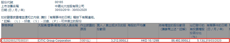 智通财经APP获悉,联交所最新资料显示,3月19日,CITIC Group增持中国光大控股(00165)321.2万股,每股作价10.1299港元,总金额约为3253.72万港元。增持后最新持股数目约为8649.2万股,最新持股比例为5.13%。