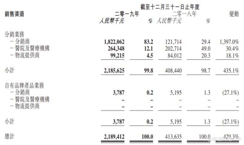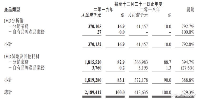 从产品类型划分上看,2019年公司IVD分析仪和IVD试剂的分销业务均出现了高速的收入增长。其中IVD分析仪收入达到3.70亿元,同比增长792.7%;IVD试剂及其耗材的收入达到18.16亿元,同比增长394.7%。