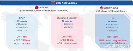 2019年12月9日,在第61届美国血液学会(ASH)年会上,传奇生物首次公布了在美国进行的JNJ-68284528有效性及安全性的Ib/II期CARTITUTE-1研究的最新临床试验数据。结果显示,在美国进行的Ib/II期注册临床结果更新至中位观察6个月,总缓解率(ORR)达到100%,完全缓解率(CR)69%。显示疗效在同一靶点的CAR-T疗法中最优、同时临床剂量只有竞争对手Bluebird的约1/10。综合美国和中国的临床数据来看,金斯瑞BCMACAR-T较现有疗法在有效率和无进展生存期等指标上均有突破性的进展。