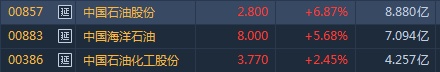 截至14时16分,中石油(00857)涨6.87%,报价2.8港元,中海油(00883)涨5.68%,报8港元。中石化(00386)涨2.45%,报3.77港元。