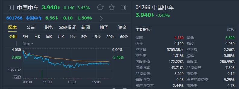 该行表示,下调对中国中车H股股份目标价,由6.1港元降至4.55港元,维持“中性”评级,并下调集团今明两年盈利预测分别6%及8%。