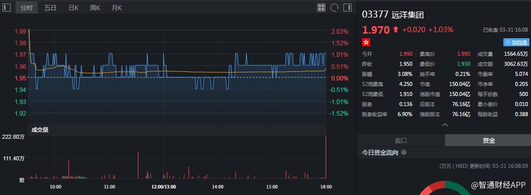 截至今日收盘,远洋集团(03377)涨1.03%,报1.97港元。