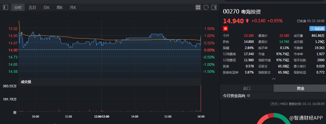 截至今日收盘,粤海投资(00270)涨0.95%,报14.94港元。