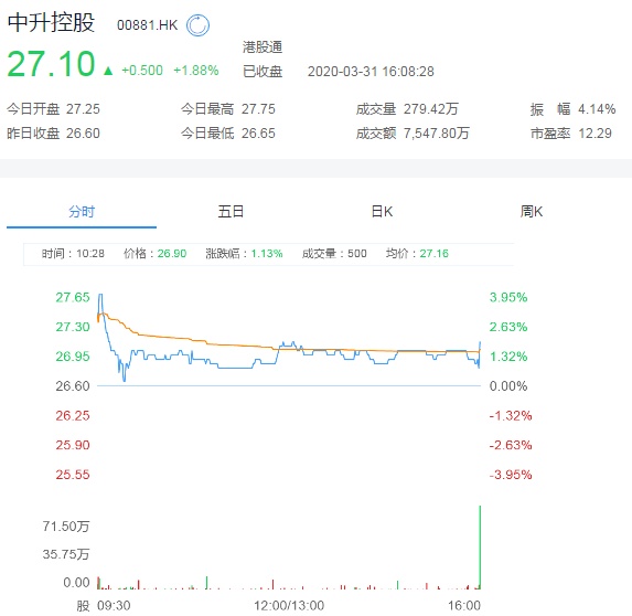截至今日收盘,中升控股涨1.88%,报27.1港元。