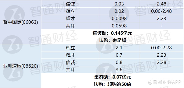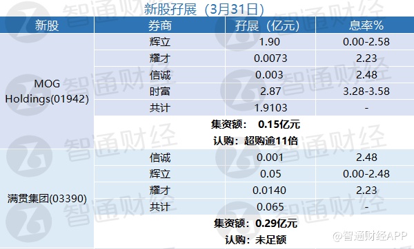 智通财经APP获悉,MOG Holdings(01942)、满贯集团(03390)、智中国际(06063)、亚洲速运(08620)正在招股中,截至3月31日,MOG Holdings超购逾11倍、亚洲速运超购逾50倍,满贯集团及智中国际认购均未足额。