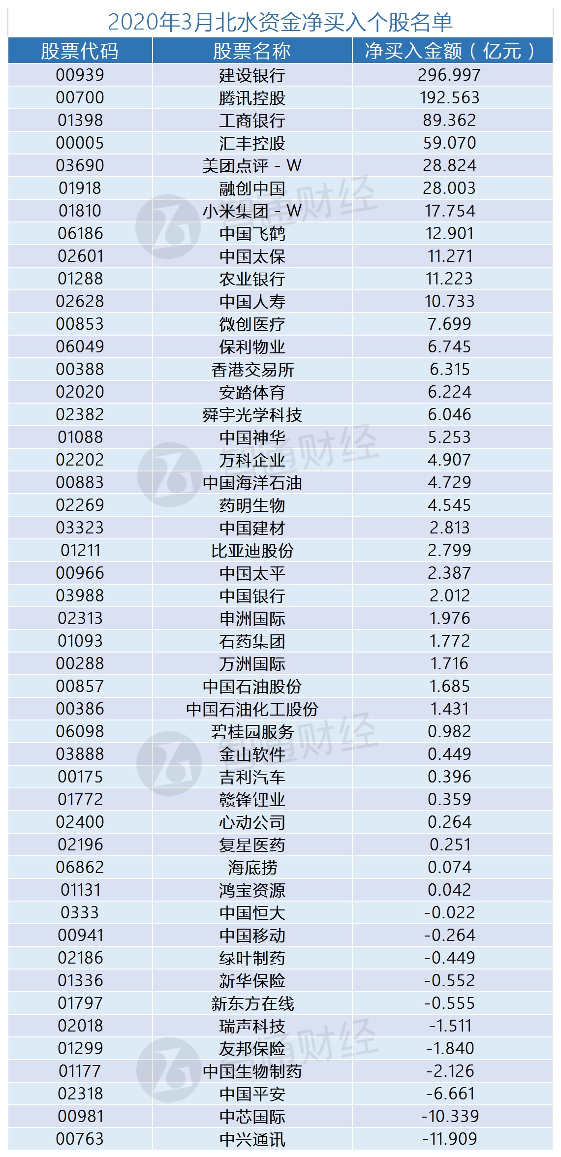 具体来看,建设银行(00939)、腾讯控股(00700)、工商银行(01398)、汇丰控股(00005)、美团点评-W(03690)为北水资金的主要买入标的,净流入资金分别为296.99亿港元、192.56亿港元、89.36亿港元、59.07亿港元和28.82亿港元。