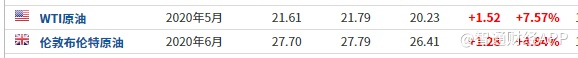 截至发稿,WTI原油涨7.57%,报21.61美元/桶。布伦特原油涨4.84%,报27.70美元/桶。