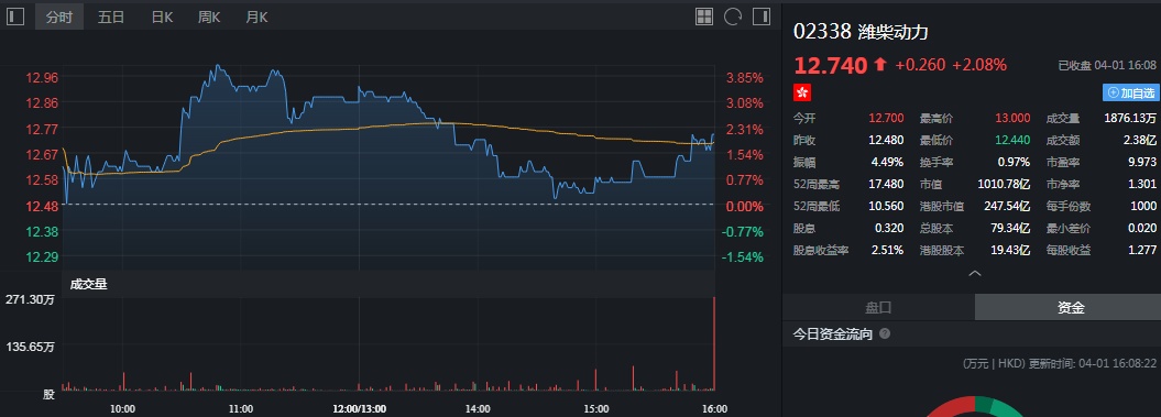 截至今日收盘,潍柴动力(02338)涨2.08%,报12.74港元。