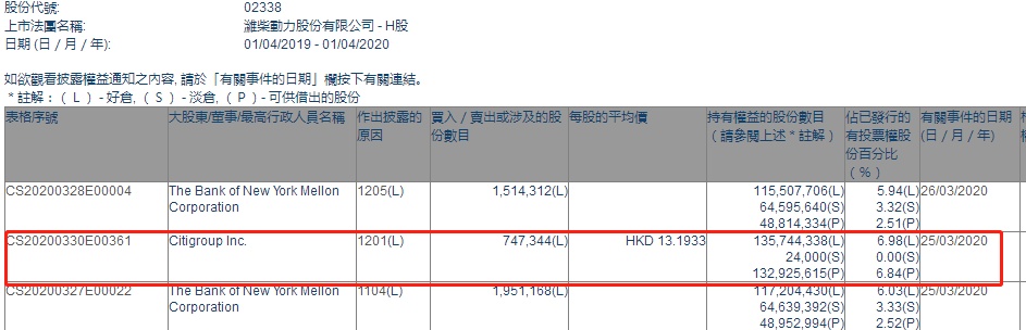 智通财经APP获悉,联交所最新资料显示,3月25日,Citigroup Inc.减持潍柴动力(02338)74.73万股,每股作价13.1933港元,总金额约为985.94万港元。智通财经APP获悉,减持后最新持股数目约为1.36亿股,最新持股比例为6.98%。