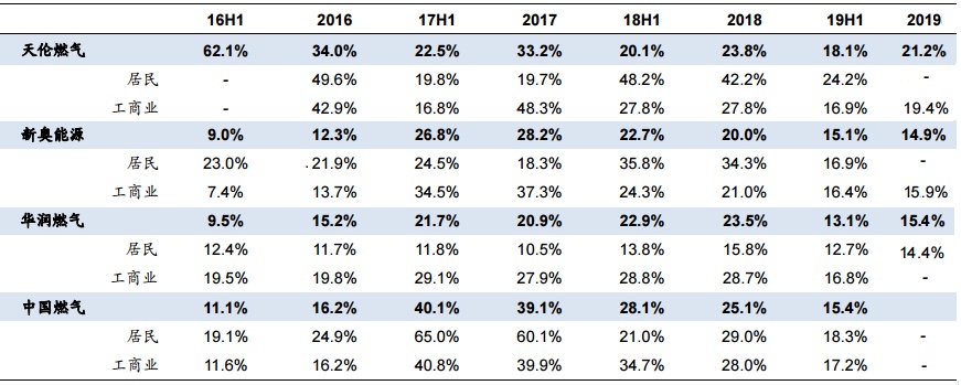 智通财经了解到,天伦燃气历史气量增速高于全国平均水平(见下图)。在2019年度燃气总销售量和工商业销气量的增长率好于分析师预期,继续领跑行业,远超全国平均水平。